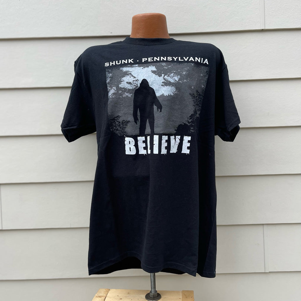 BLACK PRINTED BELIEVE BIGFOOT SHIRT W/ SHUNK, PENNSYLVANIA ON CHEST