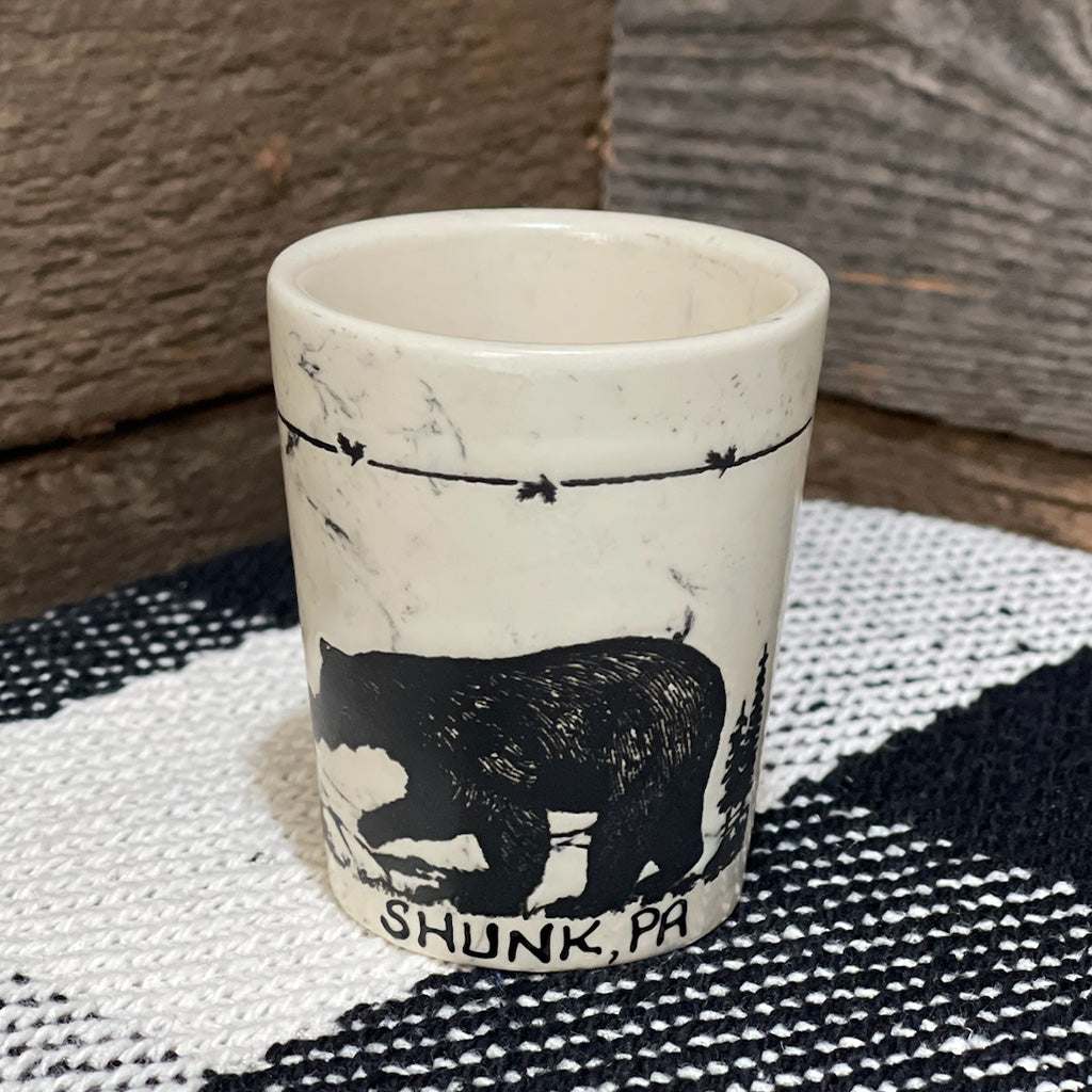 2 OZ BLACK & WHITE MARBLED SHOT GLASS W/ BLACK BEAR & SHUNK, PA